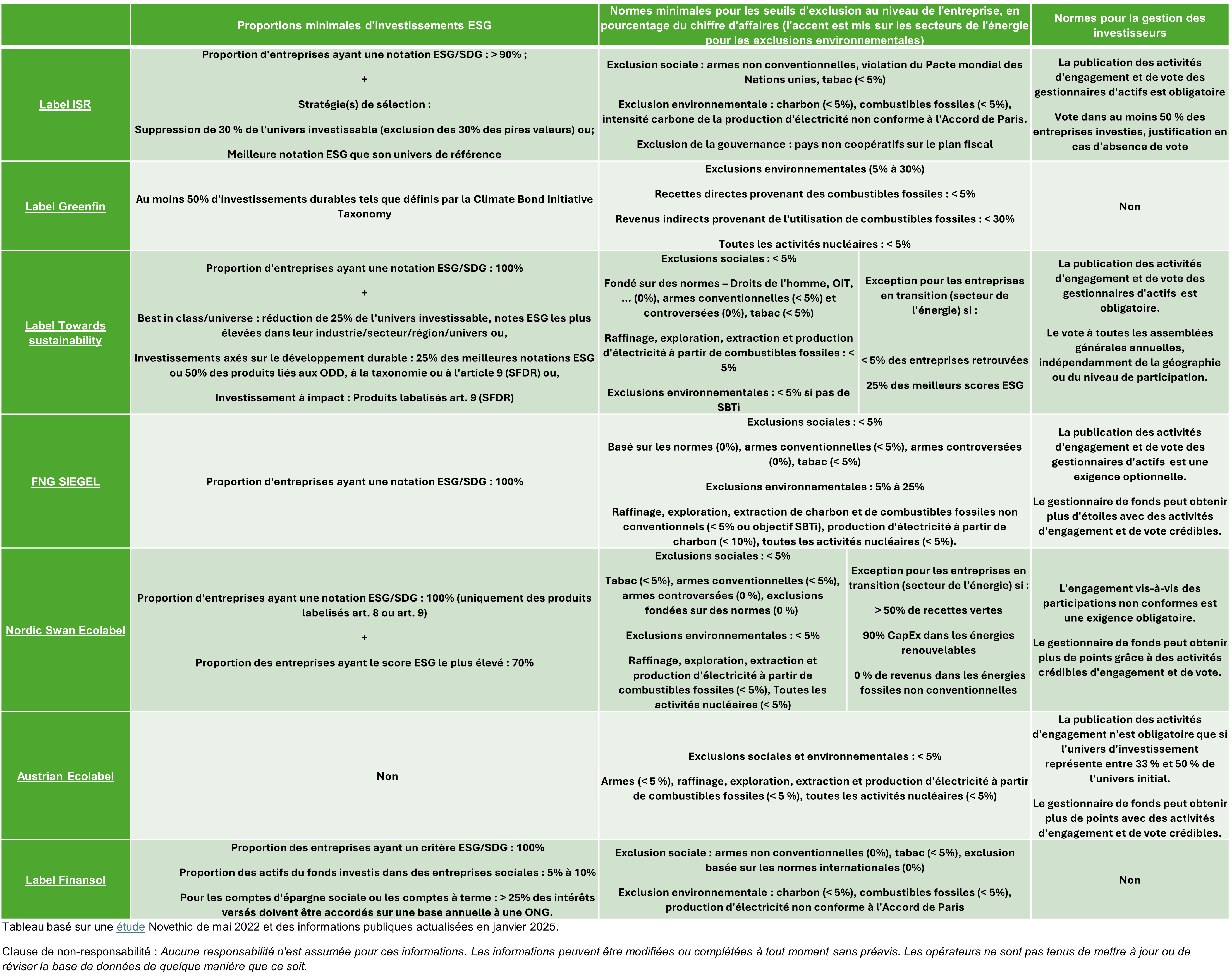 Labels : Tous les labels répertoriés utilisent des définitions, des critères minimaux et des procédures de sélection différents. Une comparaison des labels en ce qui concerne différents aspects peut être trouvée derrière le champ de clic ""Tous les labels"". A l'exception du label français Finansol, il n'est pas encore possible de déduire automatiquement l'impact du fonds à partir de l'un des labels. En principe, les différents labels peuvent convenir aux investisseurs qui sont d'avis que la prise en compte des critères définis par le label pourrait réduire les risques financiers et augmenter les opportunités. Il convient toutefois de prendre en compte le risque que l'évaluation des labels ou des notes de durabilité diffère de celle d'autres fournisseurs de notes ESG. Les labels individuels peuvent également convenir aux investisseurs qui souhaitent être cohérents avec leurs valeurs et pour lesquels la prise en compte des critères minimaux définis par le label est suffisante à cet effet.